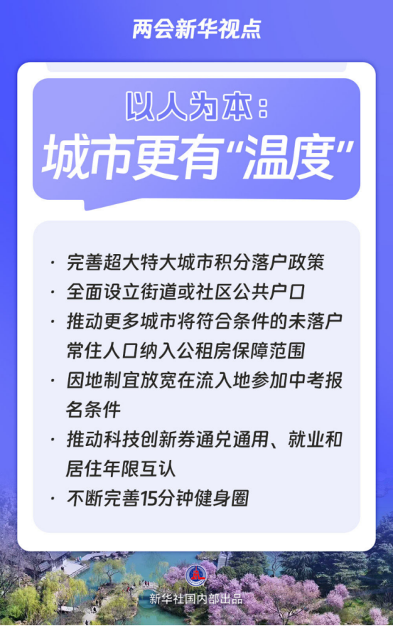 完善超大特大城市积分落户政策、全面设立街道或社区公共户口、探索建立全国统一的人口管理制度、逐步实现由常住地登记户口……纲要草案科学有序推进农业转移人口市民化。开展城市体检、加快建设完整社区、不断完善15分钟健身圈……纲要草案描绘了一幅触手可及的现代化人民城市图景。