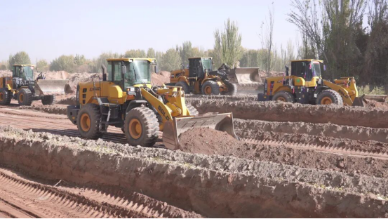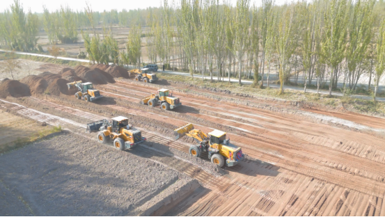 上图:石园镇阿亚格肖尔村施工现场,大型机械来回穿梭作业。