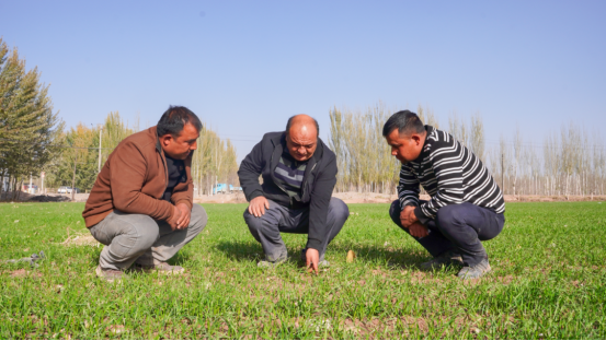 11月10日,在石园镇阔勒其村的连片麦田里,嫩绿的麦苗已纷纷破土、舒展叶片。疏附县农业农村局农业技术推广中心的技术人员正带领村民麦麦提艾力·图尔迪查看冬小麦长势,并现场指导后续科学管理要点。望着眼前又齐又壮的麦苗,麦麦提艾力·图尔迪信心满满地说:“从选种到播种,都有县里的农技人员手把手指导。如今地更肥了、技术也更好了,麦苗长得格外喜人,我对明年的好收成充满期待!”