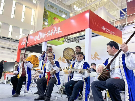 疏附县展区内传统民族乐器演奏吸引众多游客驻足观看。
