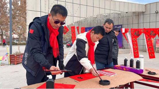 正在广场上跳舞的群众被热闹的氛围吸引,纷纷围拢过来。大家一边挑选心仪的春联,一边与书法爱好者交流讨教,不少群众还在书法老师的指导下拿起毛笔,尝试书写简单的“福”字,在一笔一画中感受中华优秀传统文化的魅力。