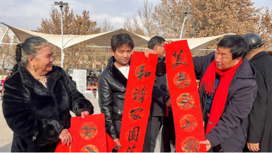 新春将至,年味渐浓。在疏附县2026年“庆元旦 迎新春”“喀什有礼 礼在疏附”之“翰墨迎新春·丹青颂华章”艺术展持续升温之际,1月16日,县委宣传部联合县文联、县新时代文明实践中心在县艺术馆前开展“万福迎春”送春联活动,为各族群众免费送上手写春联与新春祝福,让墨香与丹青相映,让祝福与年味同行。