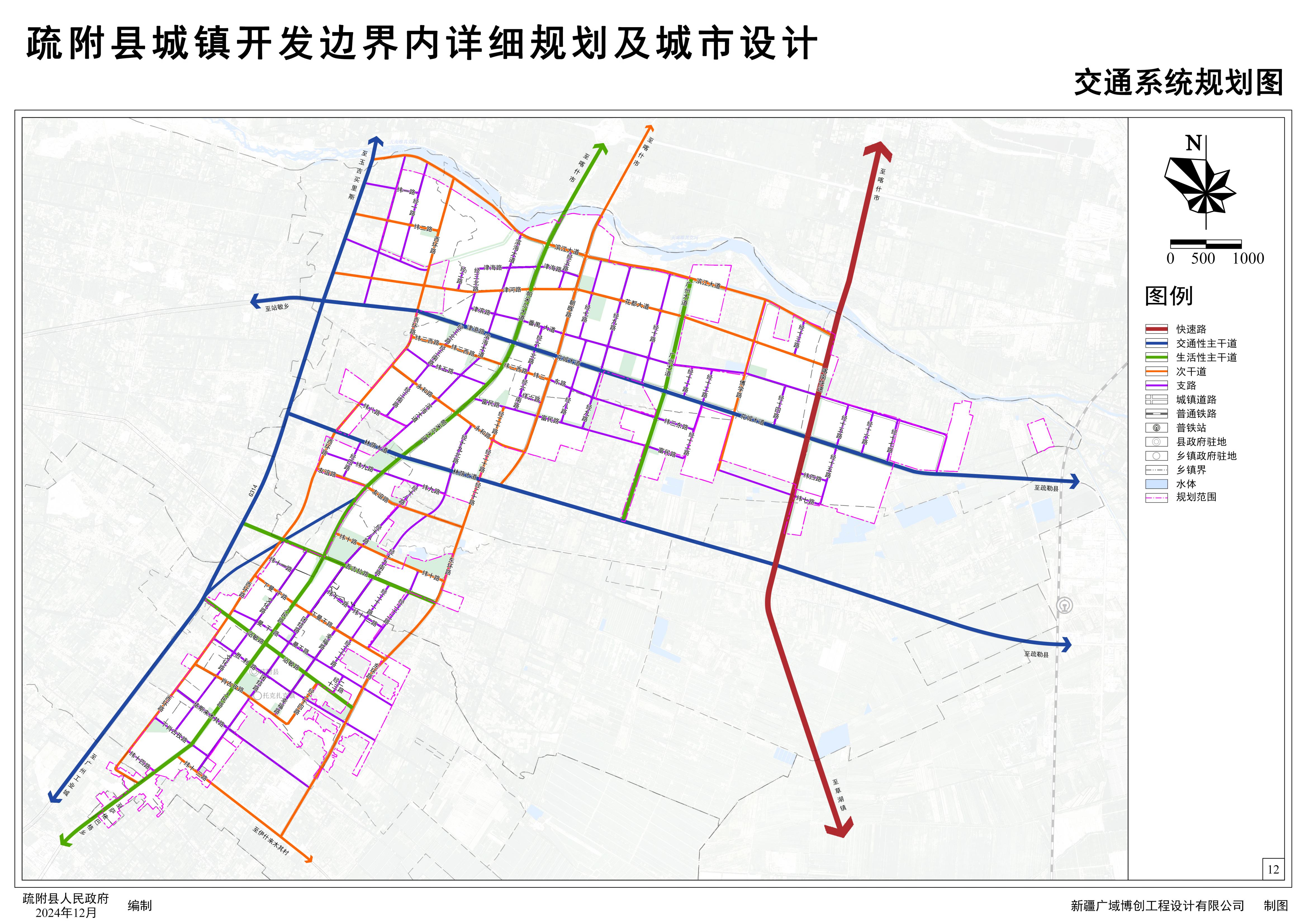 根据疏附县中心城区未来发展规划用地布局结构,构建现代化城市交通体系,本次规划确立了“四横四纵”的畅达路网结构。“四横”分别为花城大道、中央林荫大道、迎宾路和站敏路;“四纵”分别是G314国道(新线)、喀南快速、人民路、广州大道。