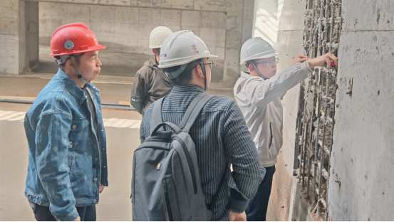 上图:覃昱钦对项目人防单元钢筋绑扎进行抽查。资料图
