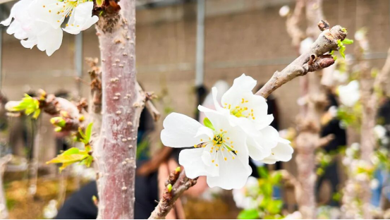 相邻的樱桃种植基地内,另一番景致同样引人入胜。一株株 “一根棍” 樱桃树整齐排列,素白的樱桃花绽放在笔直的枝干上,嫩黄花蕊吐露芬芳,清甜香气萦绕棚内。不少游客驻足观赏、用手机记录满棚繁花。“第一次见这种‘一根棍’的樱桃树,花开得太漂亮了!等樱桃熟了,我一定要带着家人再来采摘,体验亲手摘果的快乐。” 喀什市游客阿孜姑力笑着说。