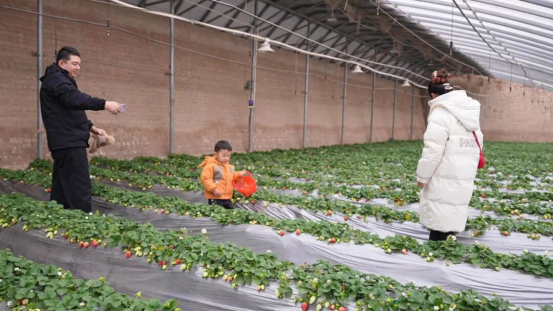 走进大棚,湿润的空气里弥漫着浓郁的草莓果香,一垄垄整齐排列的草莓藤蔓上,嫩绿叶片间点缀着颗颗饱满鲜红的果实,让人垂涎欲滴。游客们手提专用果篮,沿着垄沟缓缓前行,仔细挑选成熟的草莓,不时弯腰采摘,不少游客还相互拍照记录这一温馨欢乐时刻,大棚内处处洋溢着温馨喜悦的氛围。
