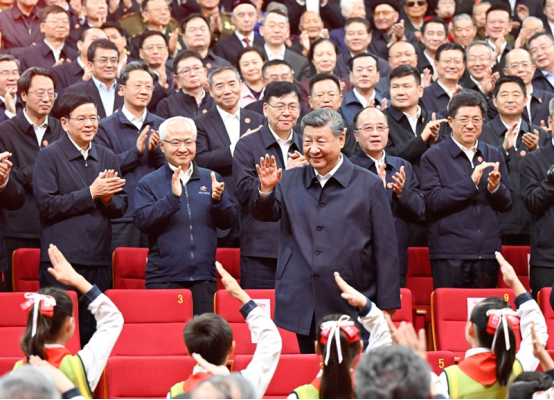 王沪宁、蔡奇、李干杰、何立峰、王小洪、雪克来提·扎克尔、谌贻琴、王东峰和刘振立,在新疆工作过的老同志,以及中央和国家机关有关部门负责同志、中央代表团全体成员一同观看演出。