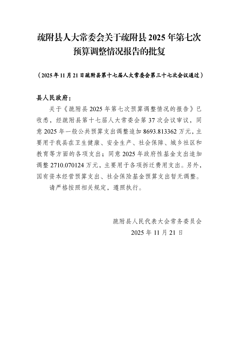 疏附县人大常委会关于疏附县2025年第七次预算调整情况的批复