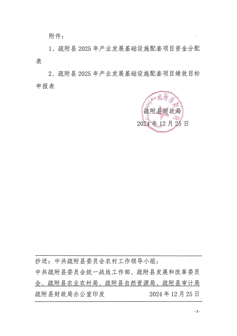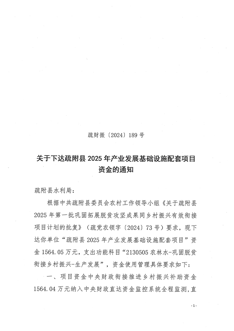 疏财振〔2024〕189号关于下达疏附县2025年产业发展基础设施配套项目资金的通知