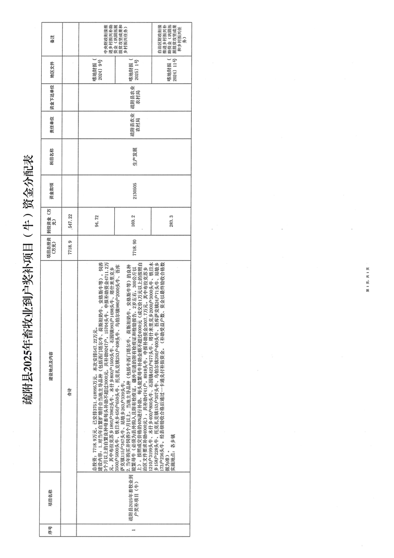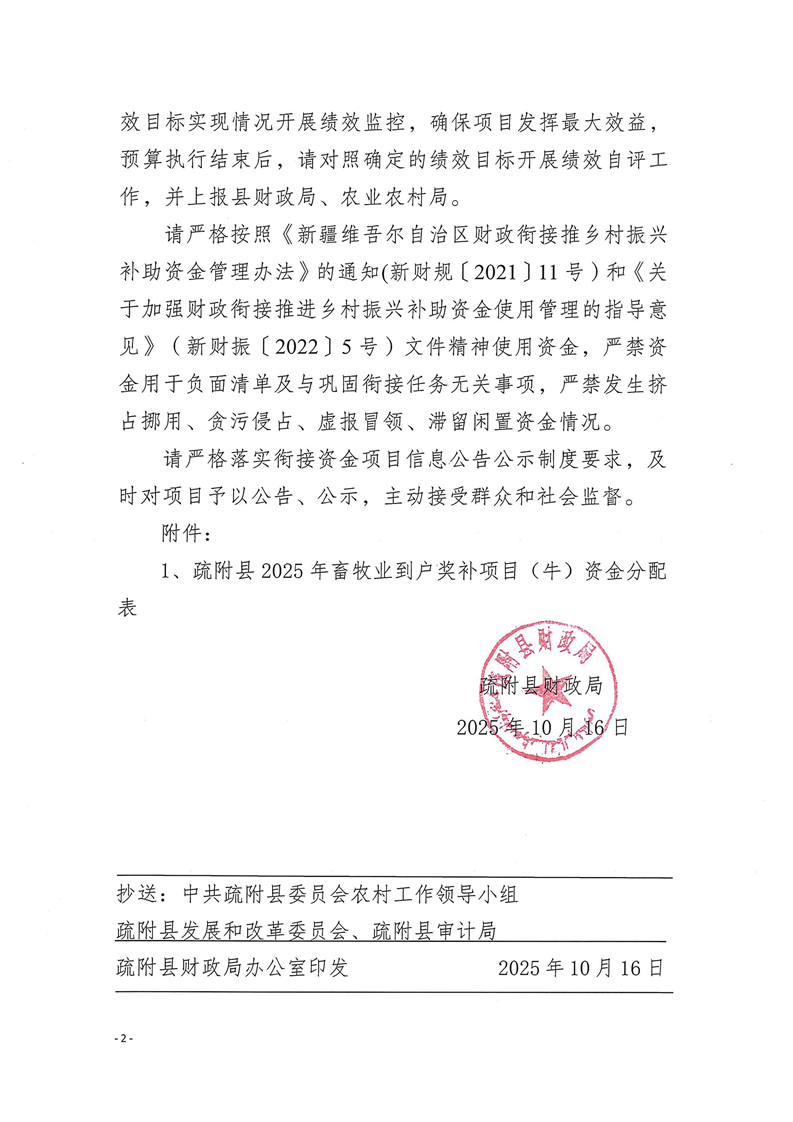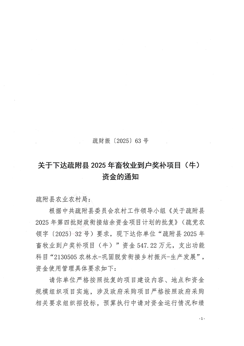 疏财振〔2025〕63号关于下达疏附县2025年畜牧业到户奖补项目(牛)资金的通知