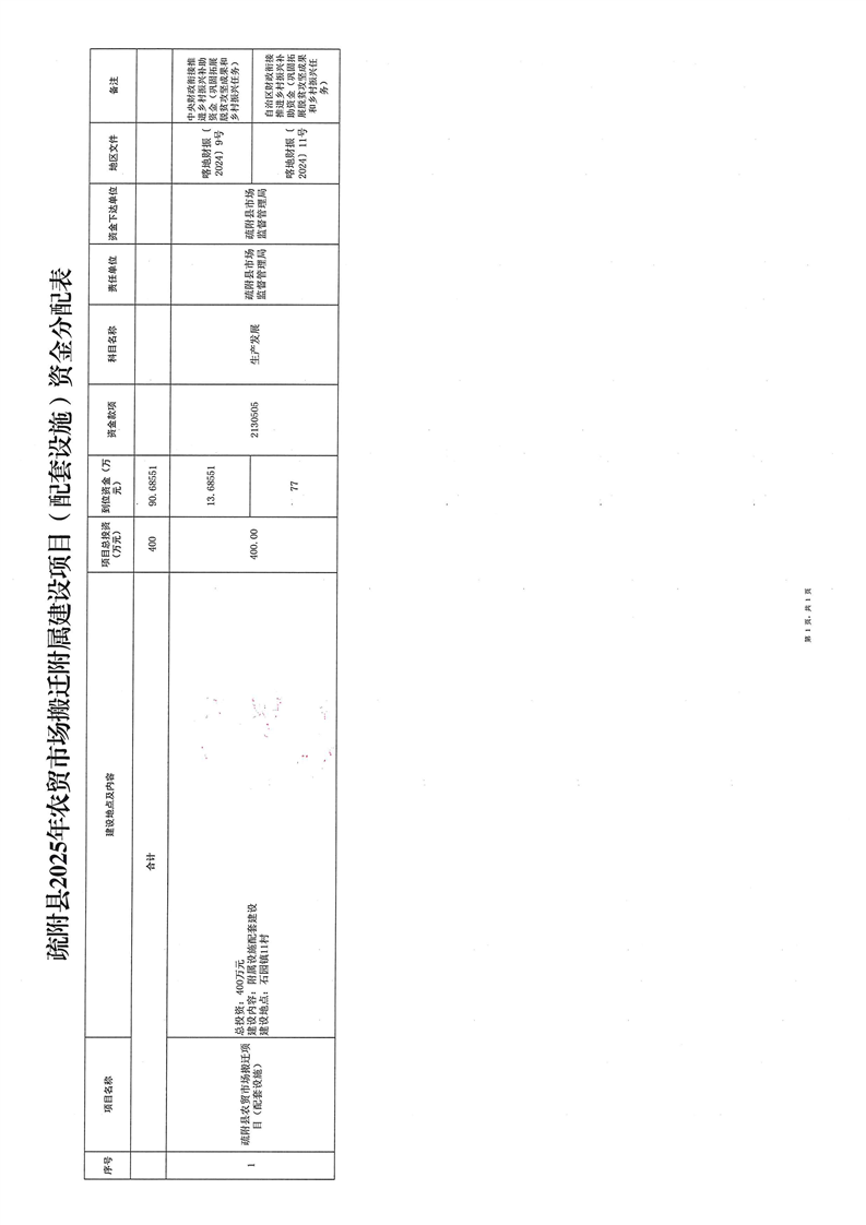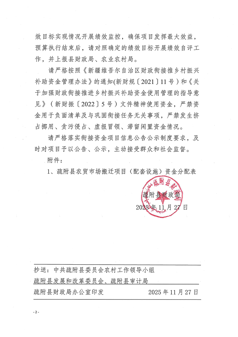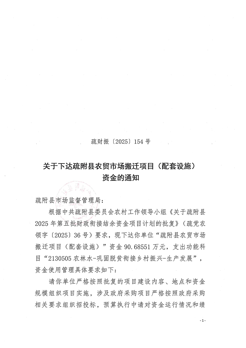 疏财振〔2025〕154号关于下达疏附县农贸市场搬迁项目(配套设施)资金的通知