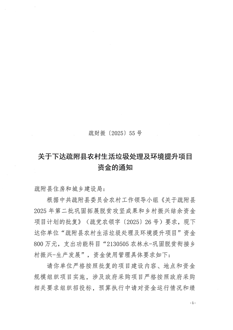疏财振〔2025〕55号关于下达疏附县农村生活垃圾处理及环境提升项目资金的通知
