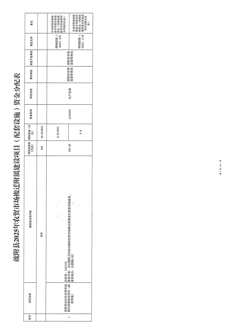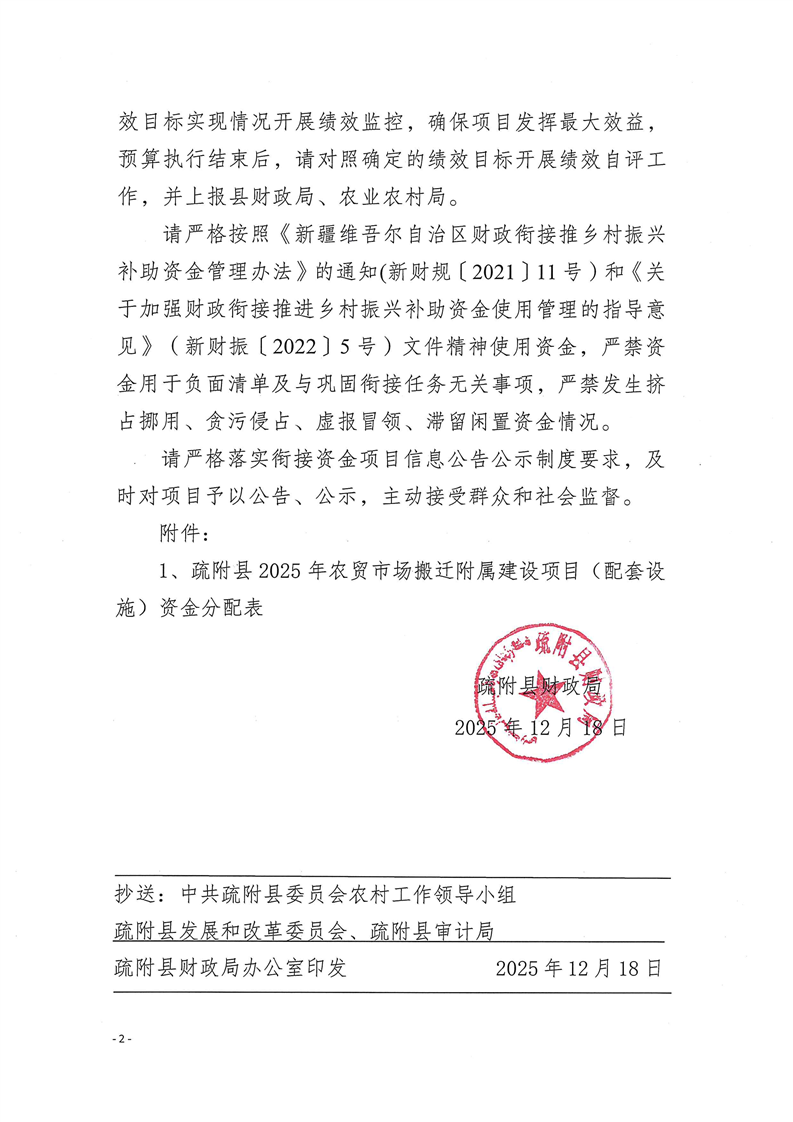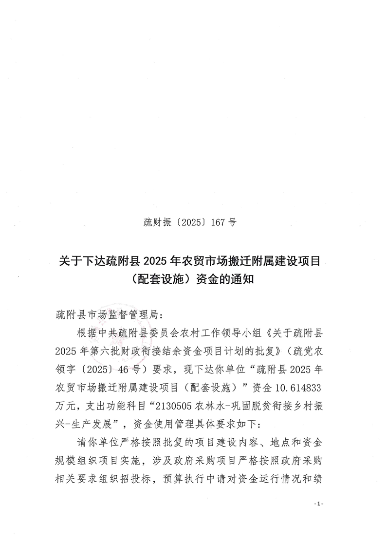 疏财振〔2025〕167号关于下达疏附县2025年农贸市场搬迁附属建设项目(配套设施)资金的通知