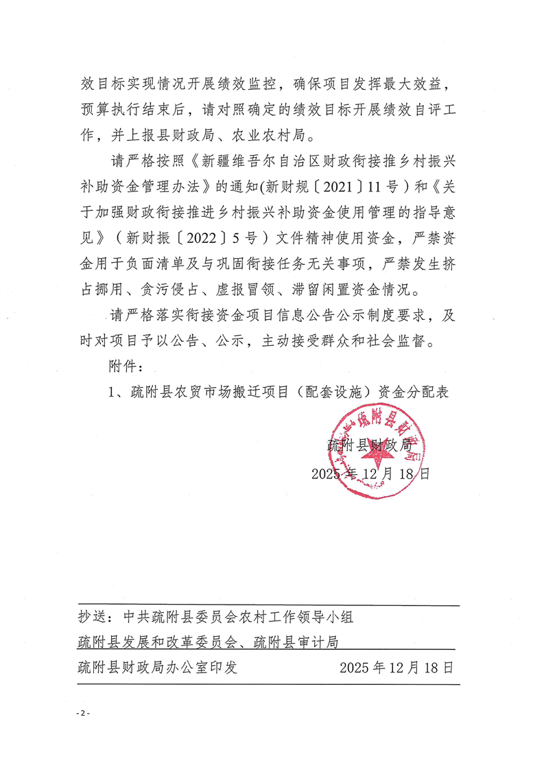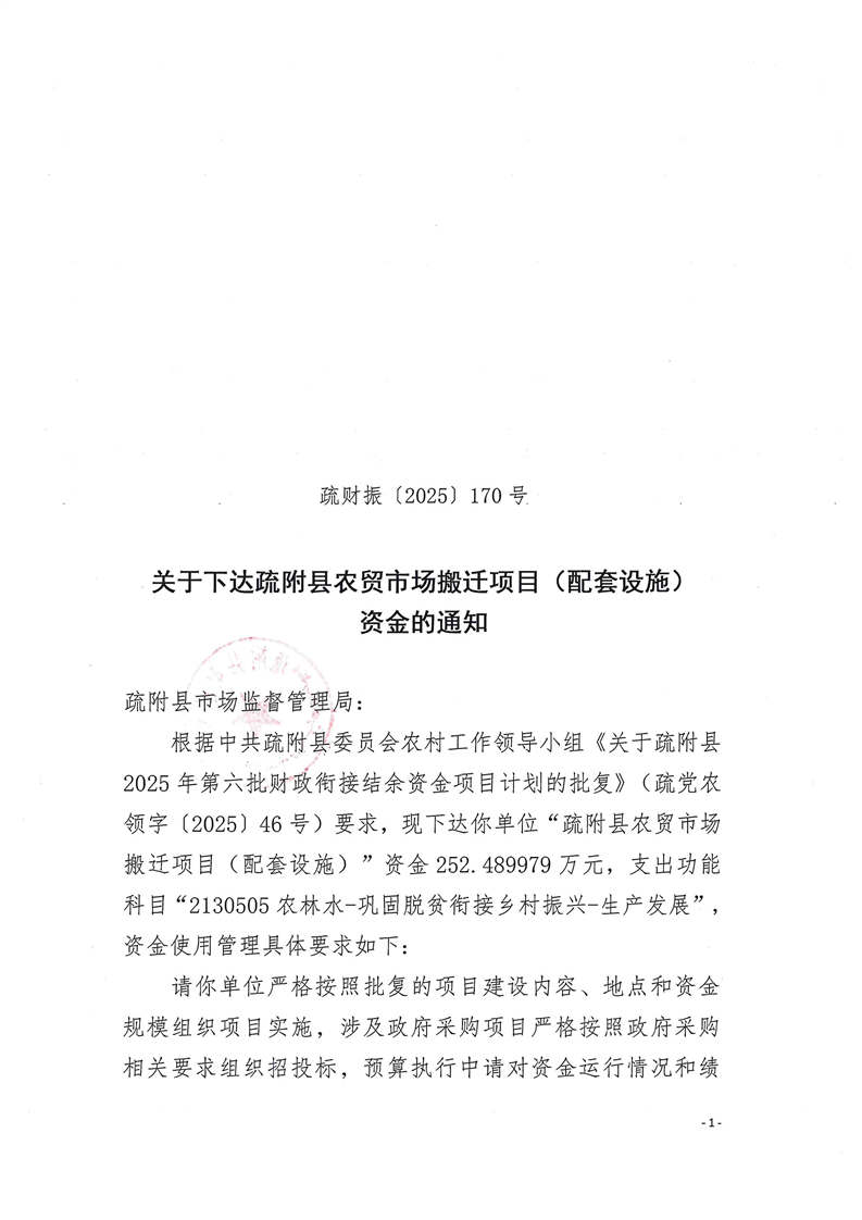 疏财振〔2025〕170号关于下达疏附县农贸市场搬迁项目(配套设施)资金的通知
