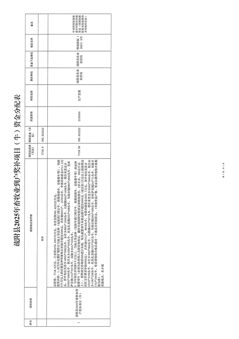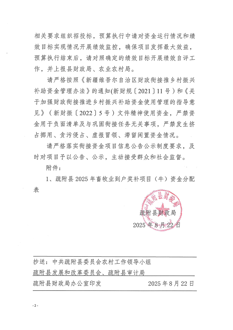 疏财振〔2025〕59号关于下达疏附县2025年畜牧业到户奖补项目(牛)资金的通知