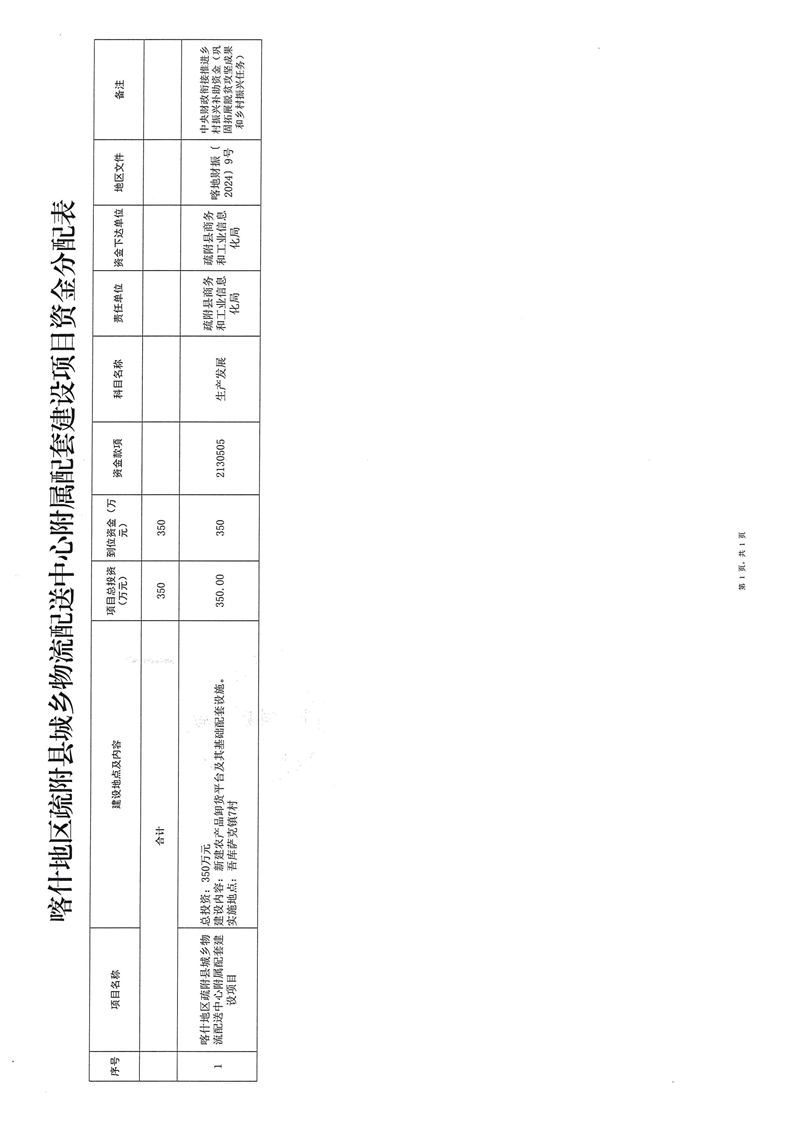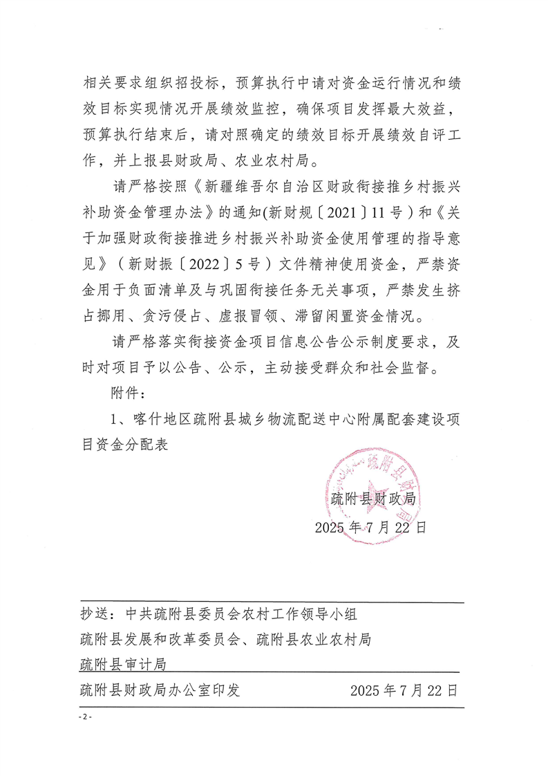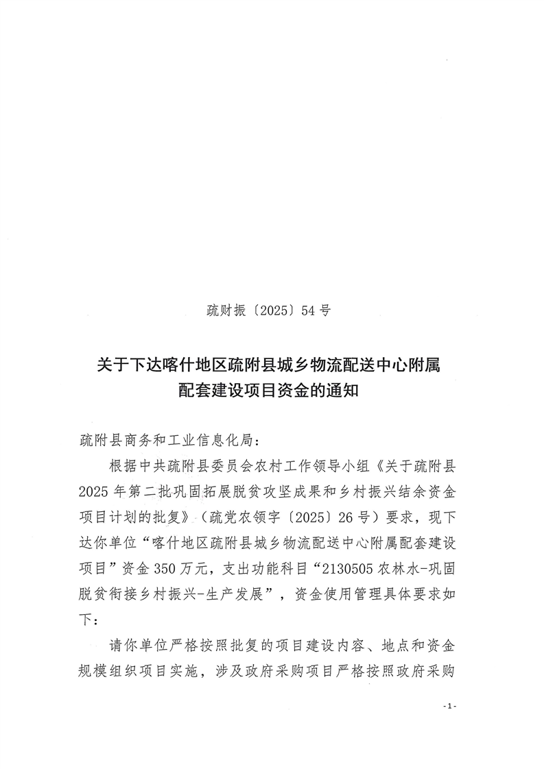 疏财振〔2025〕54号关于下达喀什地区疏附县城乡物流配送中心附属配套建设项目资金的通知