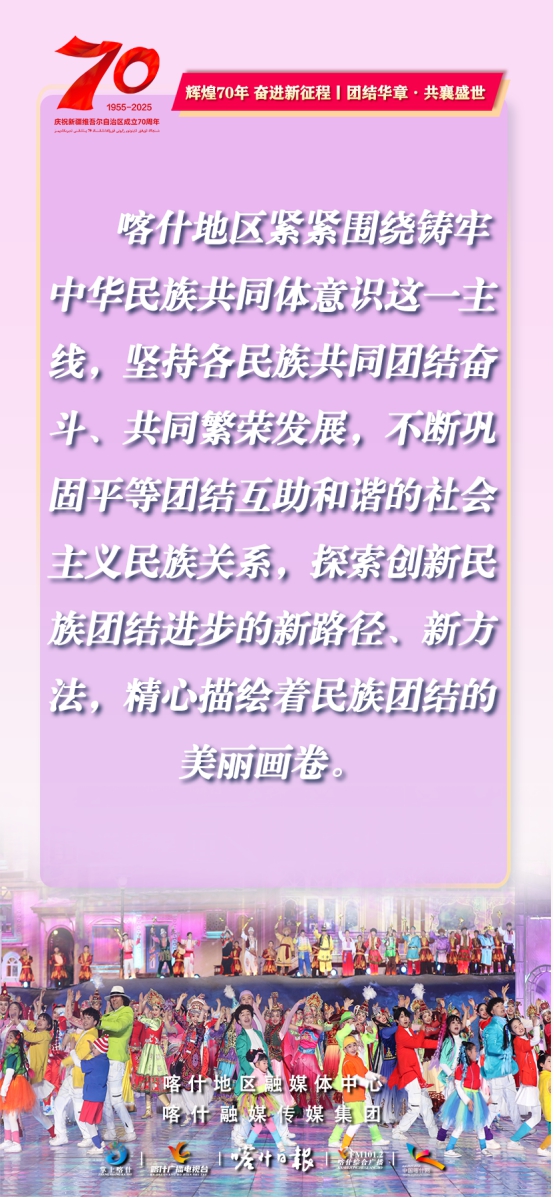 70载风雨兼程,70载砥砺奋进。行走在喀什的城乡大地,田间地头有共话丰收的笑语,工厂车间有协作攻坚的身影,校园课堂有共筑梦想的眼神,民族团结的暖流浸润着每一寸土地,汇聚成建设美丽新疆、共圆祖国梦想的磅礴伟力。