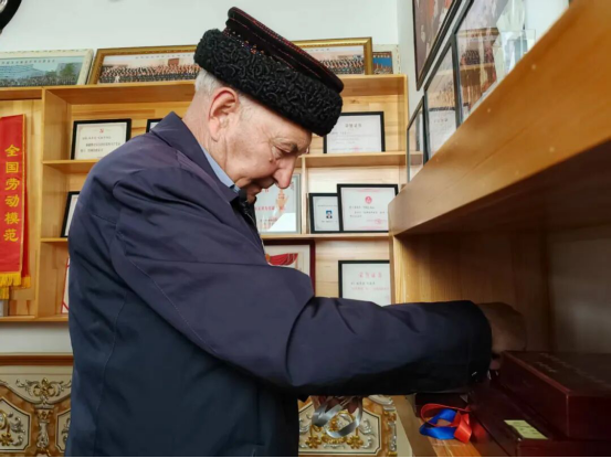 “人民卫士”国家荣誉称号获得者巴依卡·凯力迪别克在家中整理荣誉奖章和证件。 喀什地区融媒体中心 记者陈昭淋 摄