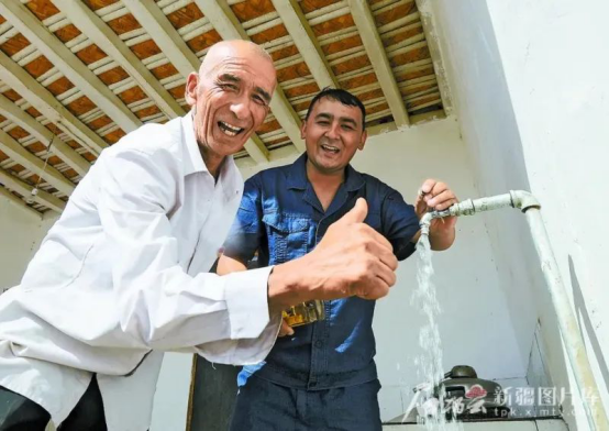 2020年6月16日,伽师县古勒鲁克乡供水站工作人员帮古勒鲁克村村民阿卜杜热西提·阿卜来提(左)更换了新水龙头(资料图)。自治区水利厅 供图