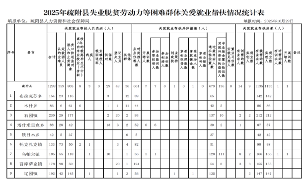 2025 年,疏附县人力资源和社会保障局深入贯彻落实《自治区推动劳动者就业关爱帮扶行动方案》和《喀什地区推进劳动者就业关爱帮扶行动方案》工作要求,以 “精准识别、多元帮扶、实效导向” 为抓手,扎实推进就业困难人员、脱贫人口及防止返贫监测对象等重点群体就业帮扶工作,全年累计帮扶 1288 名困难人员实现就业增收,全县就业形势保持总体稳定。现将主要成效公示如下,主动接受广大群众监督,如有异议,请与疏附县人力资源和社会保障局联系。