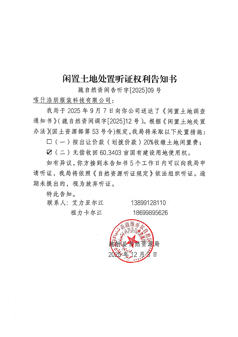 喀什浩朋服装科技有限公司闲置土地处置听证权利告知书