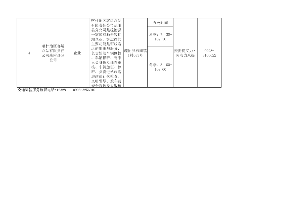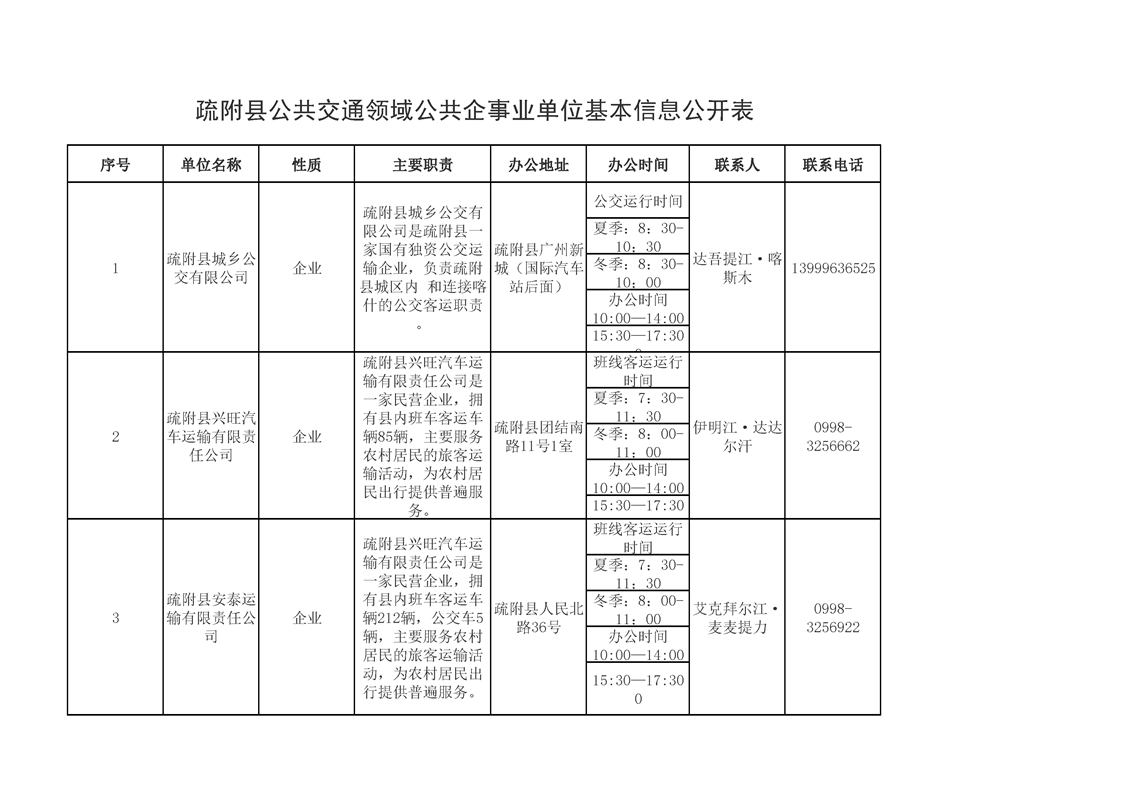 疏附县公共交通领域公共企事业单位基本信息公开表